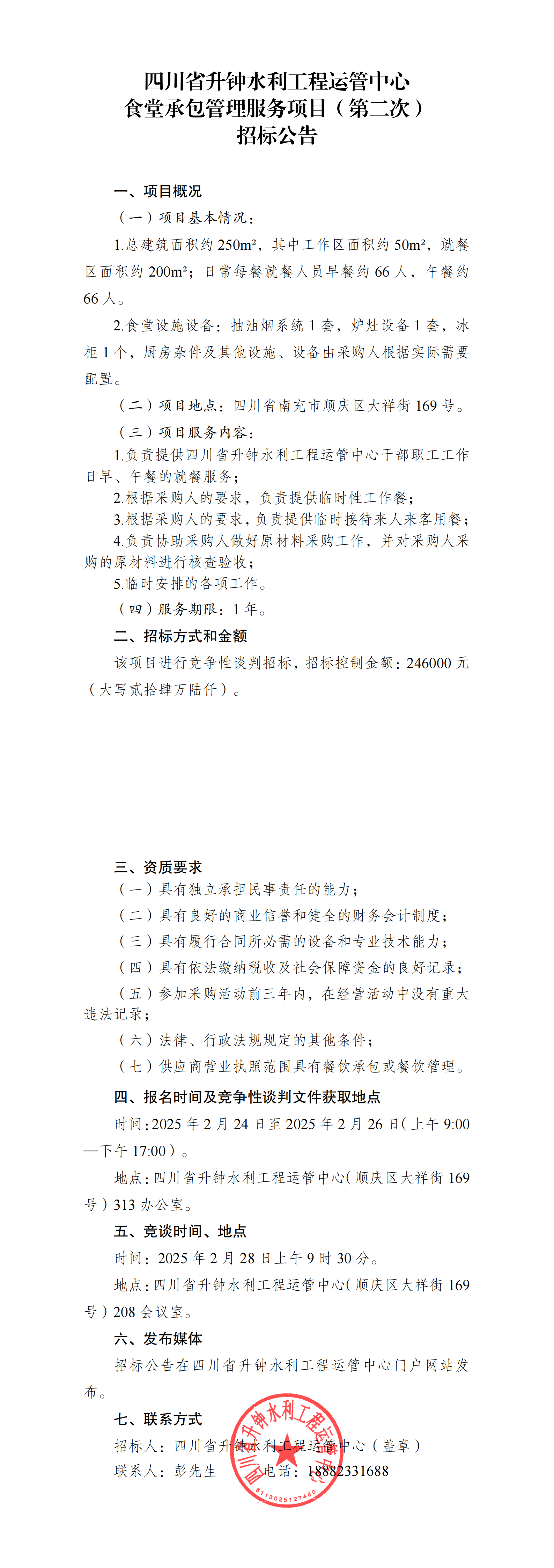 四川省升鐘水利工程運(yùn)管中心食堂承包管理服務(wù)項(xiàng)目(第二次)招標(biāo)公告