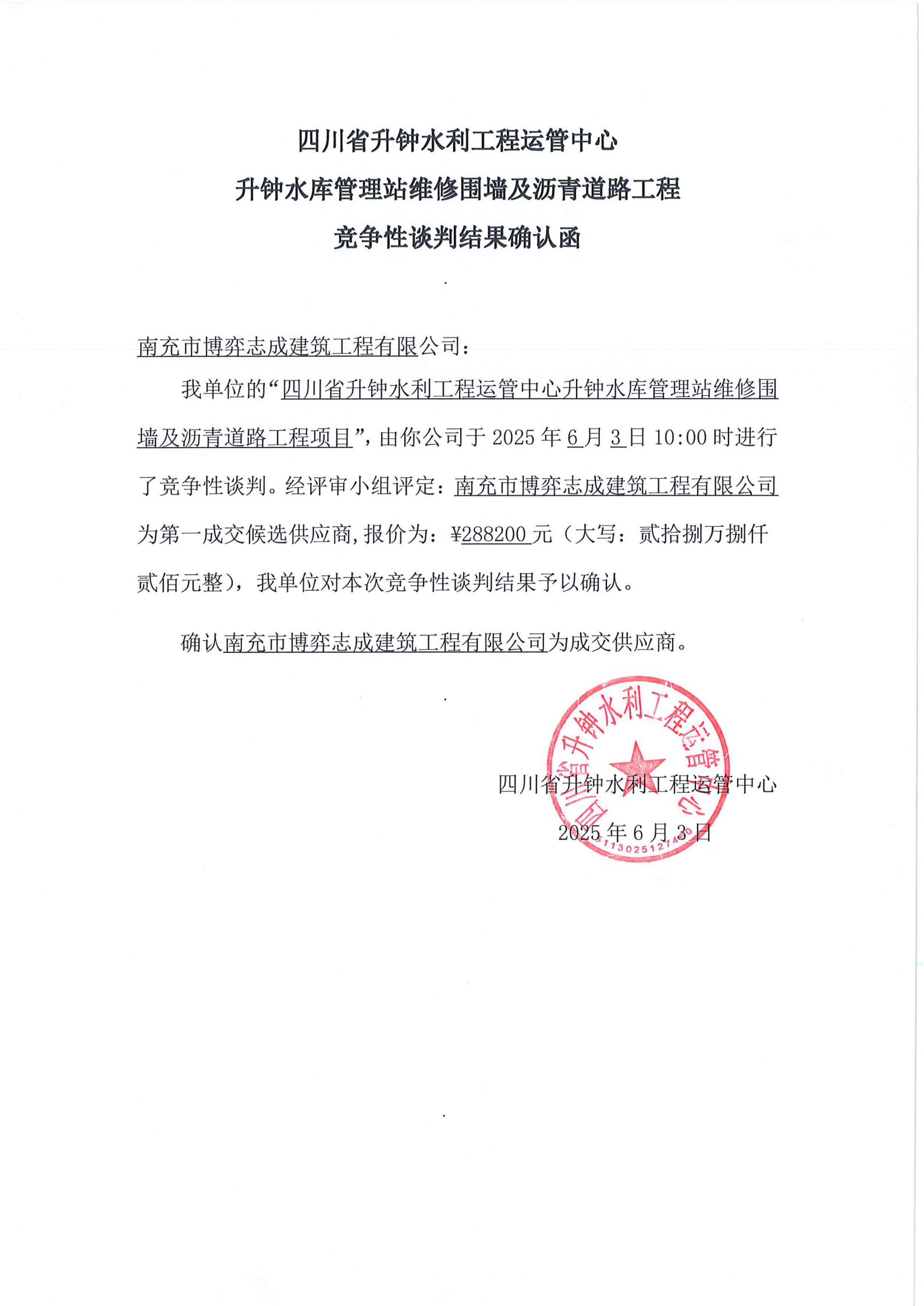 升鐘水庫管理站維修圍墻及瀝青道路工程競爭性談判結(jié)果確認(rèn)函