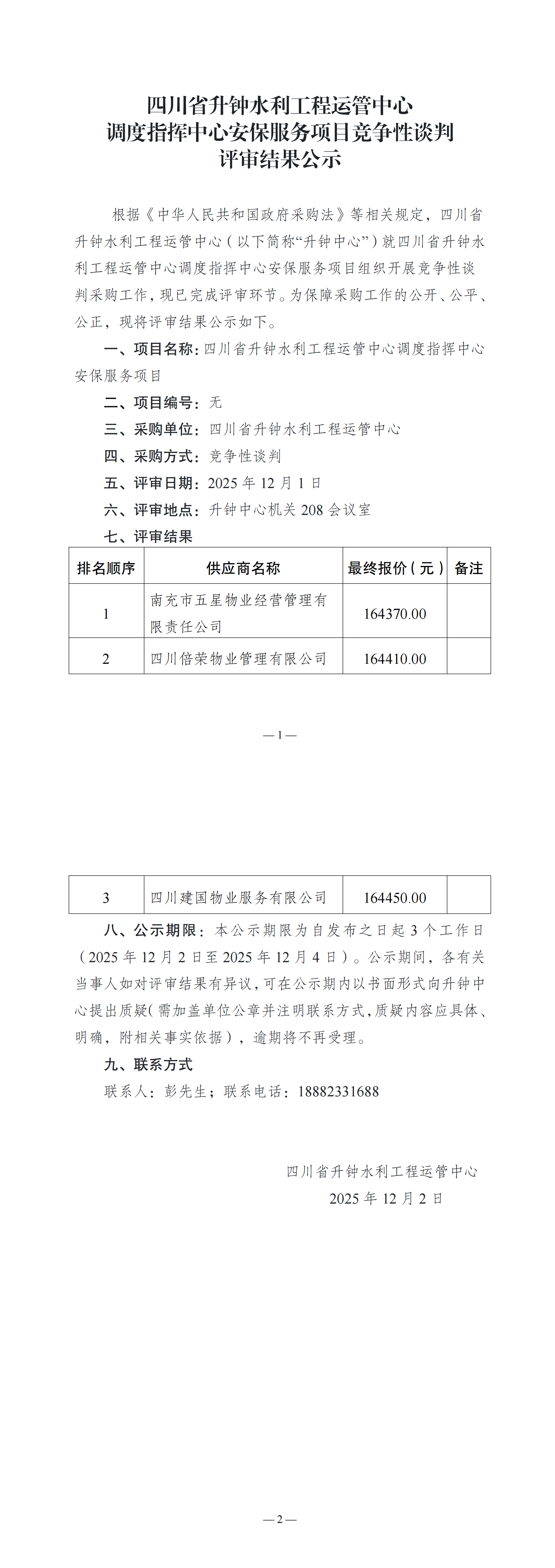 四川省升鐘水利工程運管中心調(diào)度指揮中心安保服務(wù)競爭性談判評審結(jié)果公示