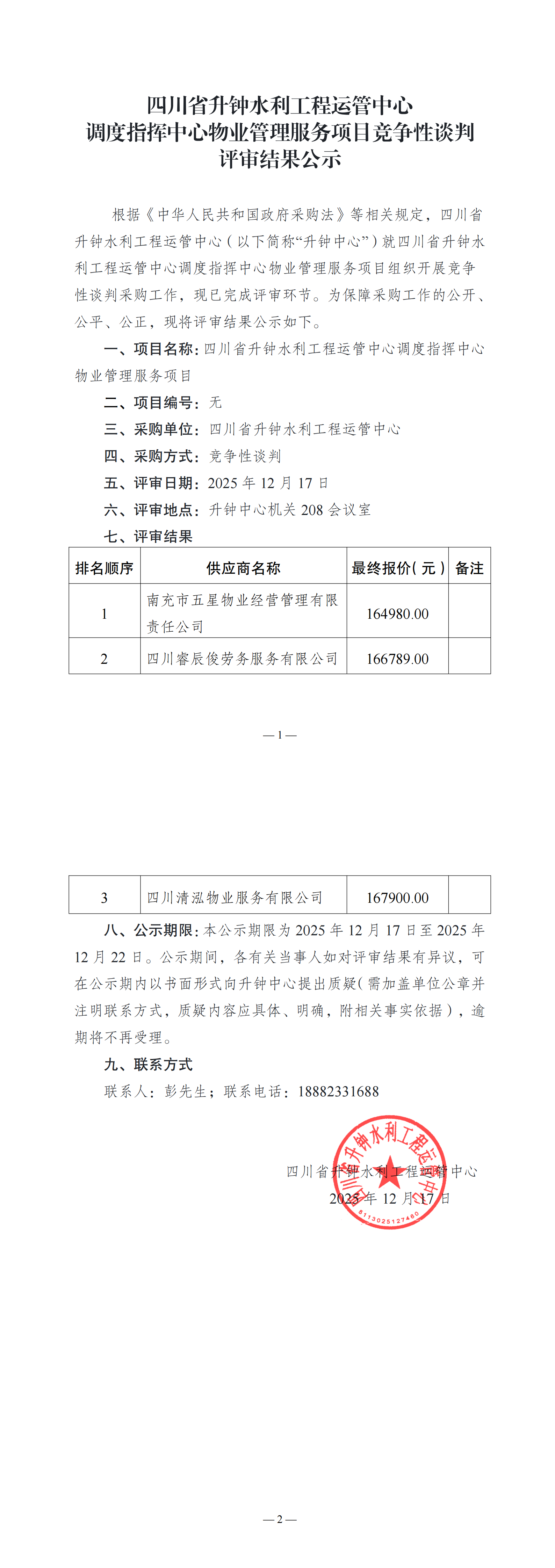 調(diào)度指揮中心物業(yè)管理服務項目競爭性談判評審結(jié)果公示
