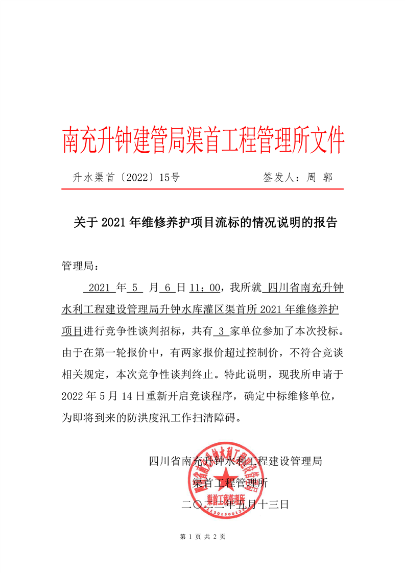 南充升鐘建管局渠首所關(guān)于2021年維修養(yǎng)護(hù)項(xiàng)目流標(biāo)的情況說明