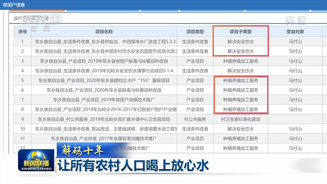 水能解渴,更能致富。在全國扶貧開發(fā)信息系統(tǒng)中,我們找到了過去十年中“因水致貧”的家庭。當(dāng)我們查詢這些貧困戶的脫貧措施和鞏固提升措施,可以看到“解決安全飲水”和“特色種植、養(yǎng)殖產(chǎn)業(yè)”總會(huì)同時(shí)出現(xiàn)。