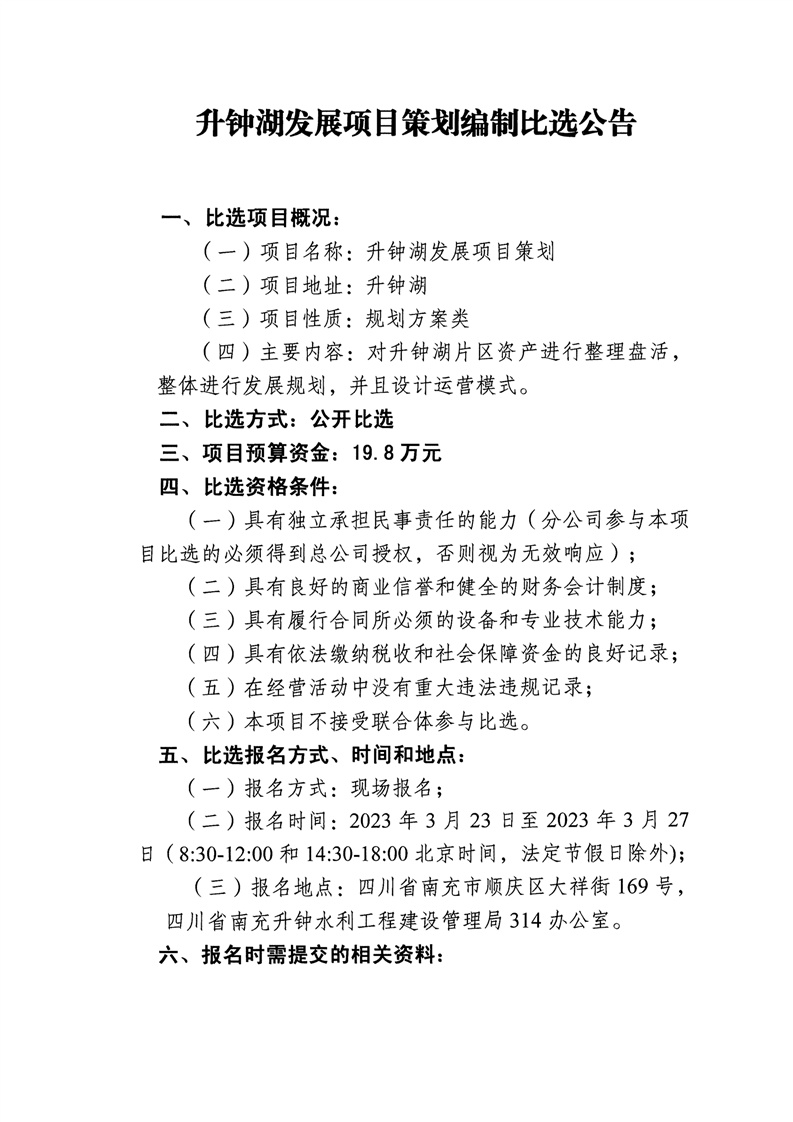 升鐘湖發(fā)展項(xiàng)目策劃編制比選公告