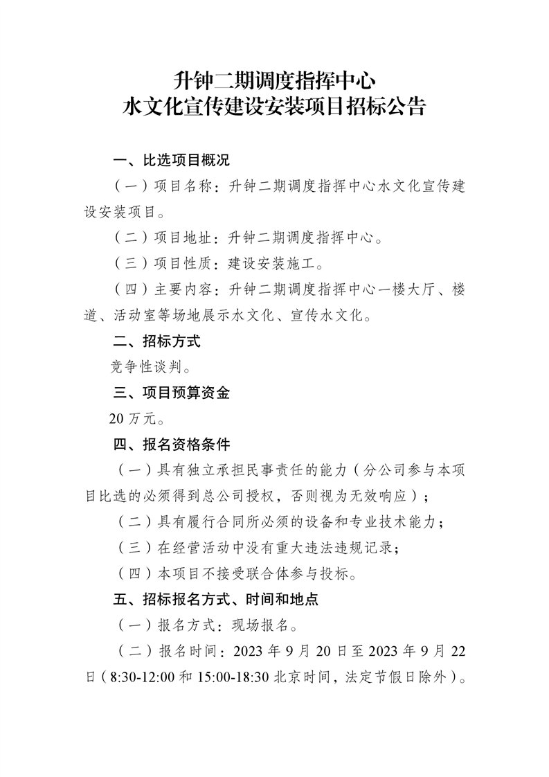 升鐘中心升鐘二期調度指揮中心水文化宣傳建設安裝項目招標公告