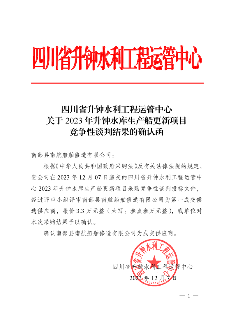 關于2023年升鐘水庫生產船更新項目競爭性談判結果的確認函