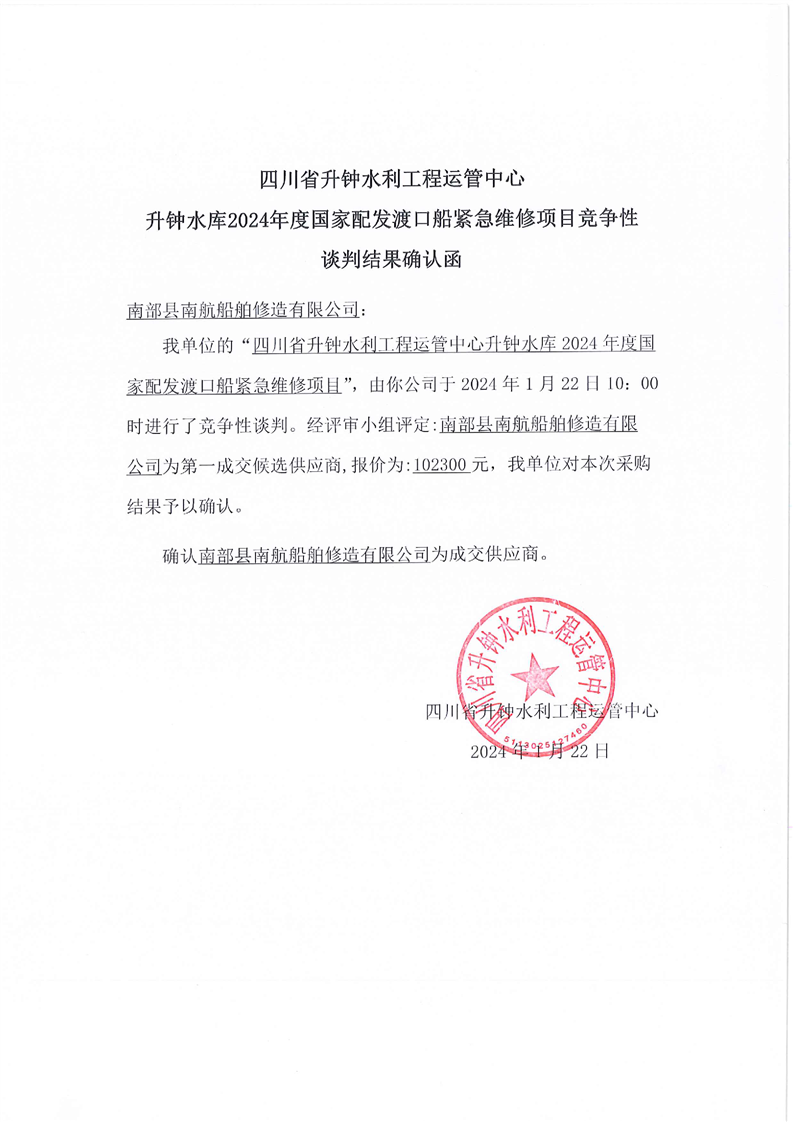 升鐘水庫2024年度國家配發(fā)渡口船緊急維修項目競爭性談判結(jié)果確認(rèn)函