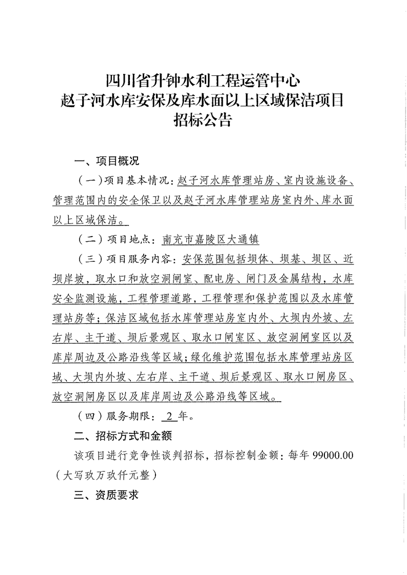 趙子河水庫安保及庫水面以上區(qū)域保潔項目招標(biāo)公告