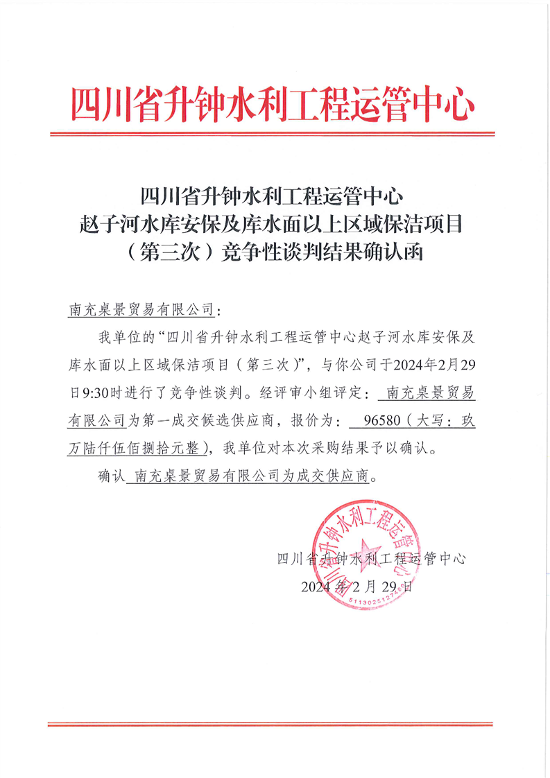 趙子河水庫安保及庫水面以上區(qū)域保潔項目(第三次)競爭性談判結果確認函