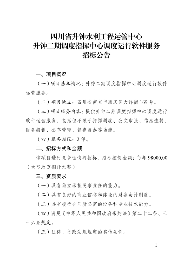 四川省升鐘水利工程運管中心升鐘二期調(diào)度指揮中心調(diào)度運行軟件服務(wù)招標(biāo)公告